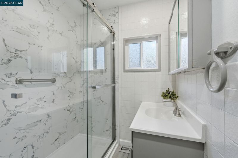 The updated bathroom continues the theme with fresh finishes and a clean, contemporary design.