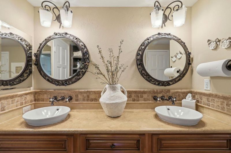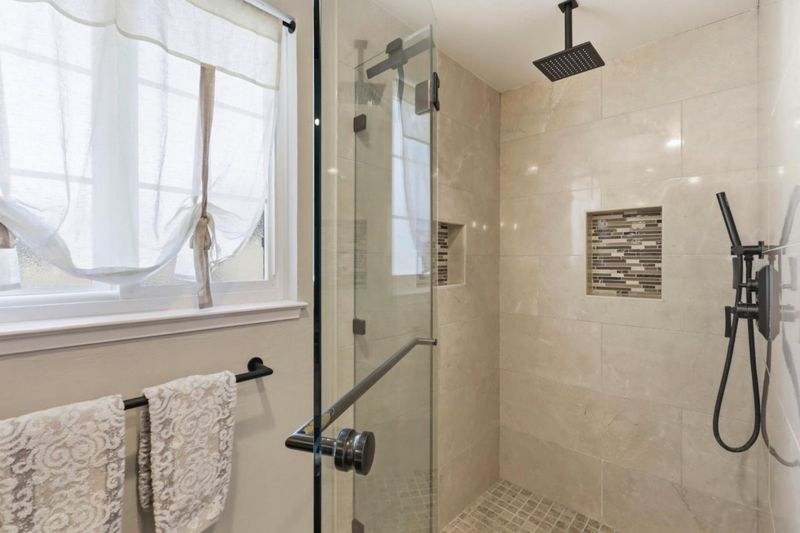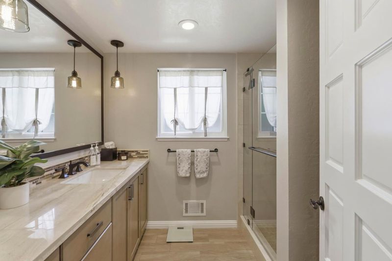 - Double Sinks, Full on Ground Floor, Granite, Marble, Shower and Tub, Stall Shower, Stone, Tile, Updated Bath